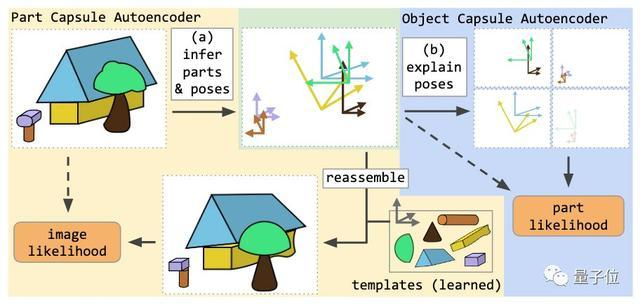 零件胶囊(PCAE)先将输入对象整体划分成一个个零件及其姿势;然后,通过仿射变换学习模板,使用姿势来构建新的输入。