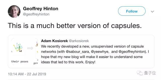 反正创始人本身应该是有信心的。最近,Hinton亲自指导了一项研究,担任论文的通讯作者,还下场点赞,称其为“更好的胶囊版本”。