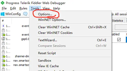 - 找到Fiddler的工具栏,打开tools中的options