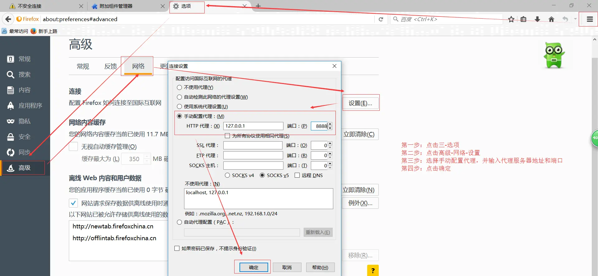 当Fiddler启动后,就默认将IE浏览器代理设置为127.0.0.1:8888,但其他浏览器如火狐浏览器则需要手动设置代理才能进行抓包,步骤如下: