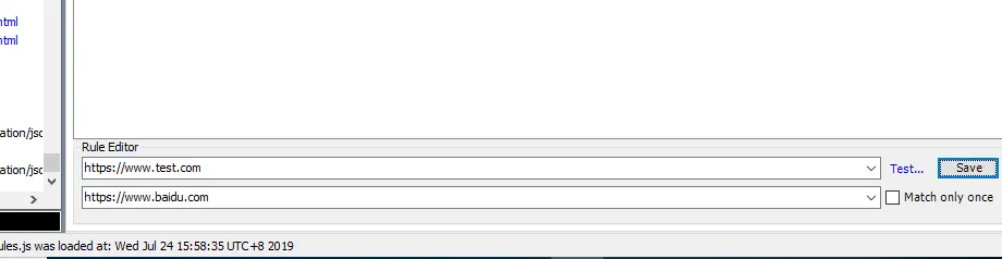- 在下面的Rule Editor中,第一栏输入要重定向的网址:www.test.com,第二栏输入响应网址:www.baidu.com,点击save即可