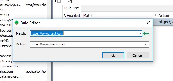 - 在match栏输入要重定向的网址:www.test.com,action栏输入响应网址:www.baidu.com,点击ok即可