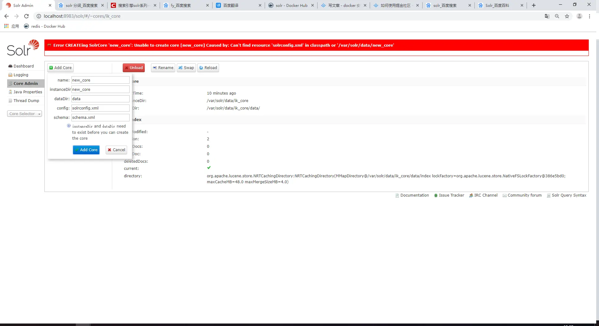 直接点击创建后/var/solr/data会创建对应域名称的文件夹,之后将/opt/solr-8.1.1/server/solr/configsets/_default/conf下的配置文件拷贝至新创建的文件夹下,再次创建域创建成功。