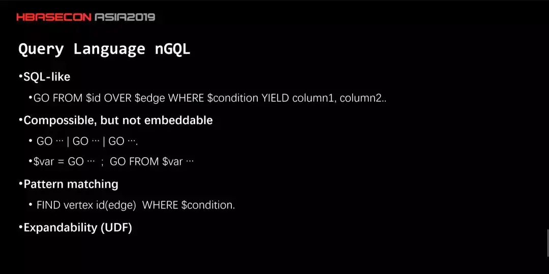 Nebula Graph 的第二个技术特点是它的查询语言,我们称为 nGQL,比较接近 SQL。唯一大一点的语法差异就是 不用嵌套 (embedding)。大家都知道嵌套的 SQL,读起来是非常痛苦的,要从里向外读。