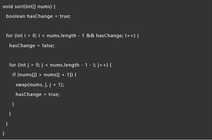 a.首先我们定义了一个布尔变量hasChange,用来标记每轮遍历中是否发生了交换。