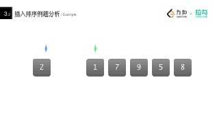 对数组 [2, 1, 7, 9, 5, 8] 进行插入排序。