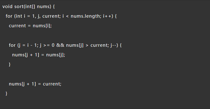 b.每次在外围循环开始的时候,把当前i 指向的值用current保存起来,以便将来把它插入到合适的位置。