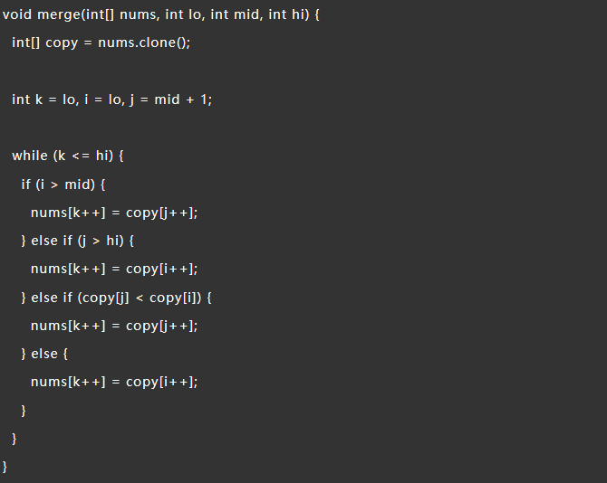 首先复制一份原来的数组,之所以要这样做,是因为我们不仅要比较左右两半的数据,而且要修改原来的数组,如果不复制原来的数组直接进行修改,那么会导致将来的比较出现错误。