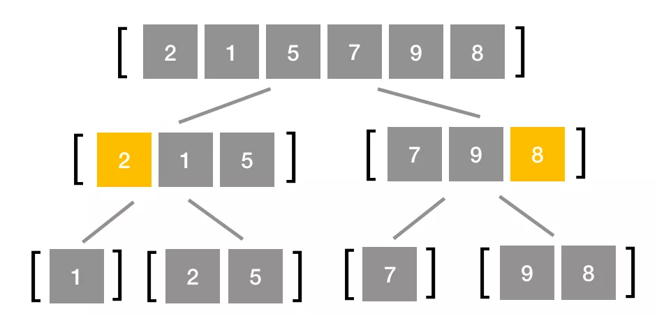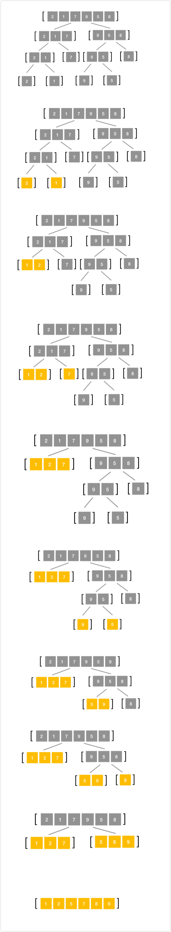 利用归并排序算法对数组[2, 1, 7, 9, 5, 8]进行排序。首先不断地对数组进行切分,直到各个子数组里只包含一个元素。演示如下图