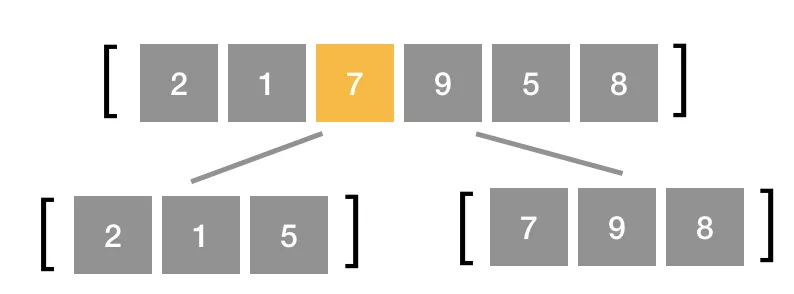 解题思路:首先把数组筛选成较小和较大的两个子数组,随机从数组里选取一个数作为基准值,比如7好了,于是原始的数组就被分成了如下两个子数组: