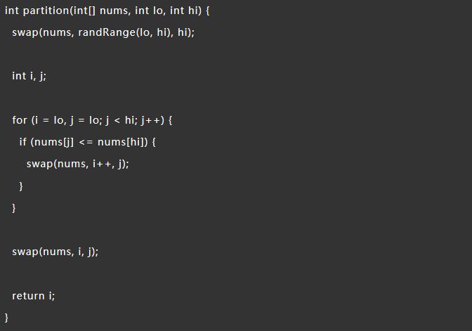 首先,为了避免最糟糕的情况出现,我们随机地选择一个数作为基准值,将它放置到最右边,也就是hi指针的位置,所以,nums[hi]就是我们的基准值。