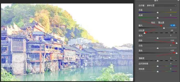 3、执行[滤镜]–「Camera Raw 滤镜」,把「曝光」调大、「对比」调小,把「阴影」和「黑色」直接拉到最大,这样可以把照片的暗部凸现出来。
