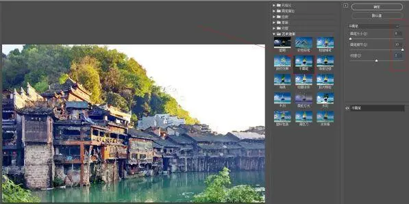 2、执行「滤镜」–「滤镜库」–「干画笔」,如图所示,三个参数分别是「0」、「10」、「2」。
