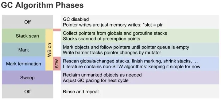 - 1.5版本在标记过程中使用三色标记法。回收过程主要有四个阶段,其中,标记和清扫都并发执行的,但标记阶段的前后需要STW一定时间来做GC的准备工作和栈的re-scan。
