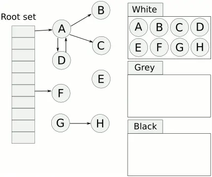 回收器通过将对象图划分为三种状态来指示其扫描过程。黑色对象为该对象及其后代已处理且该对象确认存活的,灰色对象为已经扫描到但未处理完成或者还需要再次处理的,白色对象为尚未扫描到或已经死亡的。
