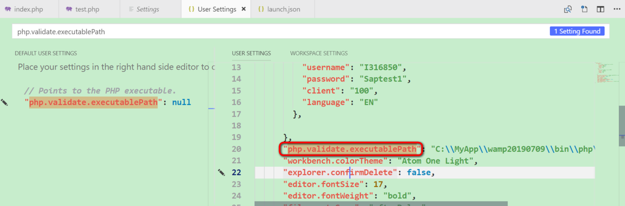 添加一条entry:php.validate.executablePath, 指向你本地的php.exe