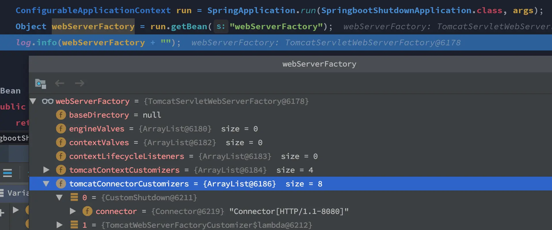 好了说回正题,我们这里使用 addConnectorCustomizers 方法将自定义的 Connector 行为添加到内嵌的Tomcat 之上,为了查看加载效果,我们可以在 Spring Boot 程序启动后从容器中获取下webServerFactory 对象,然后观察,在它的 tomcatConnectorCustomizers 属性中可以看到已经有了 CustomeShutdown 对象。