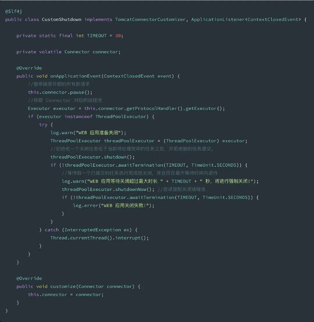 上述代码定义的 TIMEOUT 变量为 Tomcat 线程池延时关闭的最大等待时间,一旦超过这个时间就会强制关闭线程池,也就无法处理所有请求了,我们通过控制 Tomcat 线程池的关闭时机,来实现优雅关闭 Web 应用的功能。另外需要注意的是我们的类 CustomShutdown 实现了 ApplicationListener 接口,意味着监听着 Spring 容器关闭的事件,即当前的 ApplicationContext 执行 close 方法。