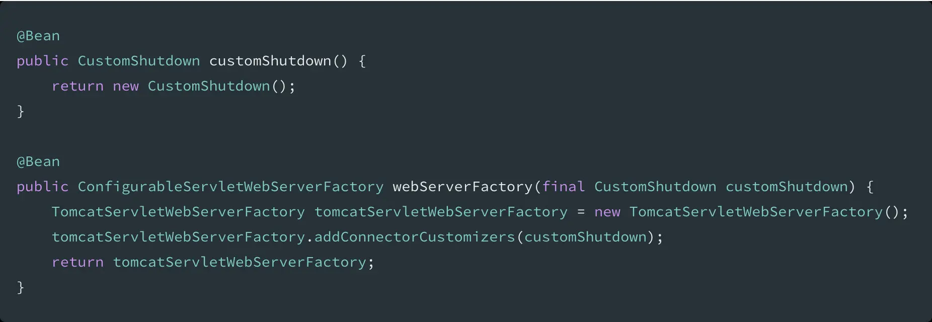 通过定制 Connector 的行为,我们就可以允许在请求处理完毕后进行 Tomcat 线程池的关闭,具体实现代码如下: