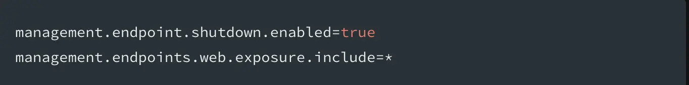 第一行表示启用 Shutdown Endpoint ,第二行表示向外部以 HTTP 方式暴露所有 Endpoint,默认情况下除了 Shutdown Endpoint 之外,其他 Endpoint 都是启用的。