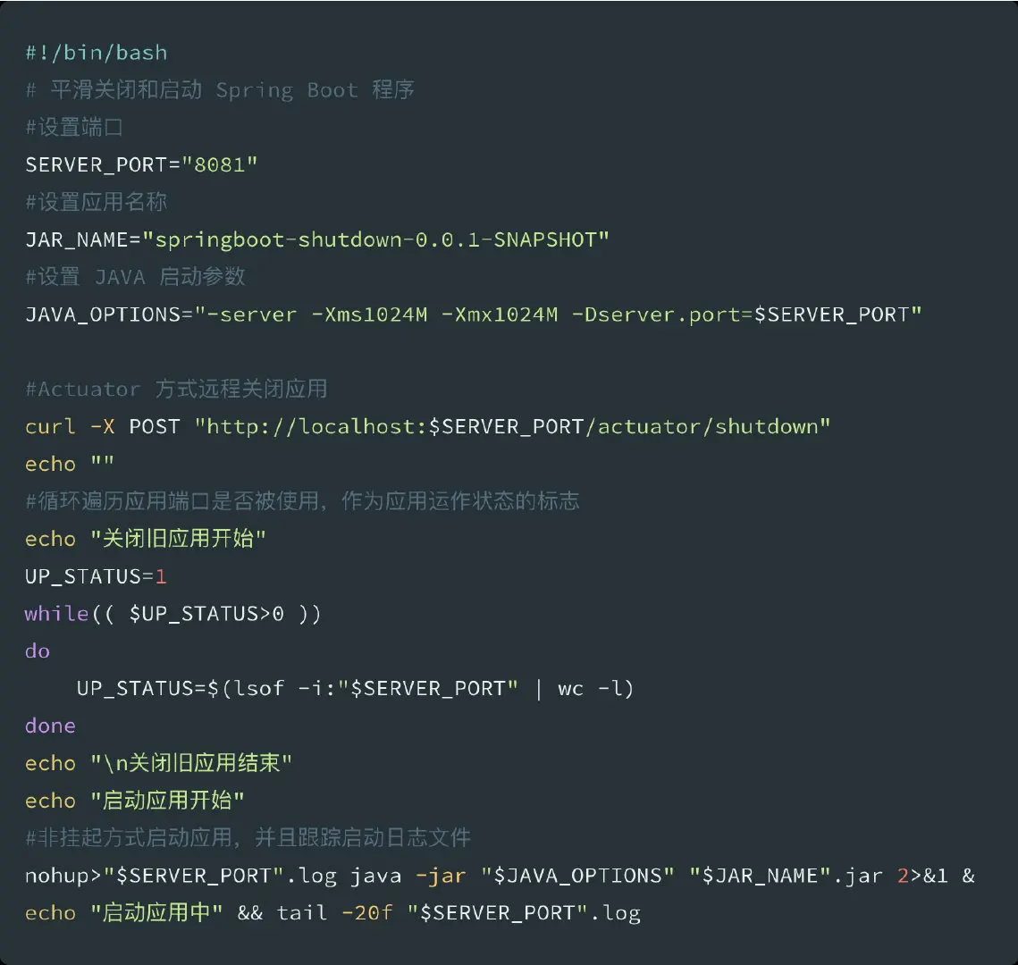 由于 Spring Boot 提供内嵌 Web 容器的便利性,我们经常将程序打包成 jar 然后发布。通常应用的启动和关闭操作流程是固定且重复的,本着 Don't Repeat Yourself 原则,我们有必要将这个操作过程自动化,将关闭和启用的 SpringBoot应用的操作写成 shell 脚本,以避免出现人为的差错,并且方便使用,提高操作效率。下面是我针对示例程序所写的程序启动脚本:(具体脚本可在示例项目查看)