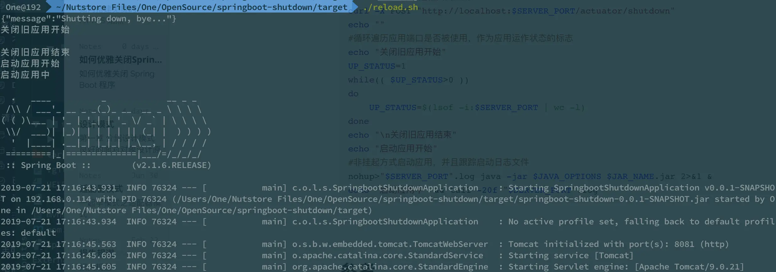 有了脚本,我们可以直接通过命令行方式平滑地更新部署 Spring Boot 程序,效果如下: