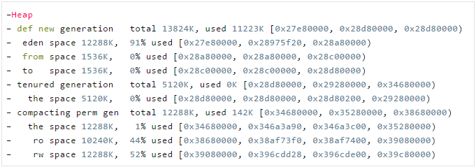 eden space 这个通常被翻译成伊甸园区,是在新生代里面的,一些创建的对象都会先被放进这里。后面那个12288K就表示伊甸园区一共的内存大小,91% used,很明显,表示已经使用了百分之多少。后面的那个0x跟上一行的解释一样。