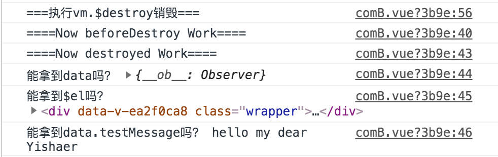 这里的测试做的还不够完善,但清楚可见走完destroyed后的组件实例已经与相应的DOM解除绑定,通过vm.$destroy()也确实能让组件实例走完destroyed钩子,实例解除了与DOM的绑定但DOM仍然会残留,官方也提倡使用v-if等数据驱动的方式控制子组件的生命周期销毁。