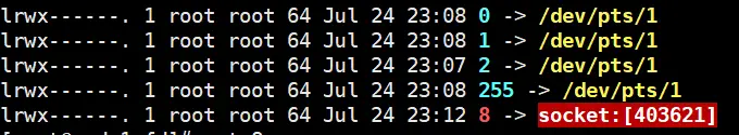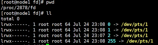 cd /proc/?/fd?代表当前bash的进程号。 fd是文件描述符 -