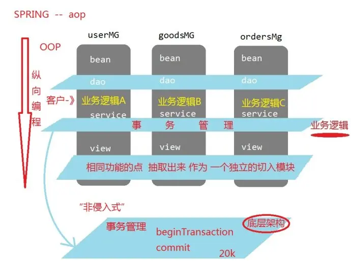 AOP(Aspect Oriented Programming),即面向切面编程,可以说是OOP(Object Oriented Programming,面向对象编程)的补充和完善。OOP引入封装、继承、多态等概念来建立一种对象层次结构,用于模拟公共行为的一个集合。不过OOP只允许开发者定义纵向的关系,但并不适合定义横向的关系,例如日志,事务,安全等。这些功能都是横向应用在业务处理中,而与它们对应的方法与其他代码基本没有联系,如异常处理和透明的持续性也都是如此,不仅增加了大量的代码量,还为程序后期的维护增生很多困难。