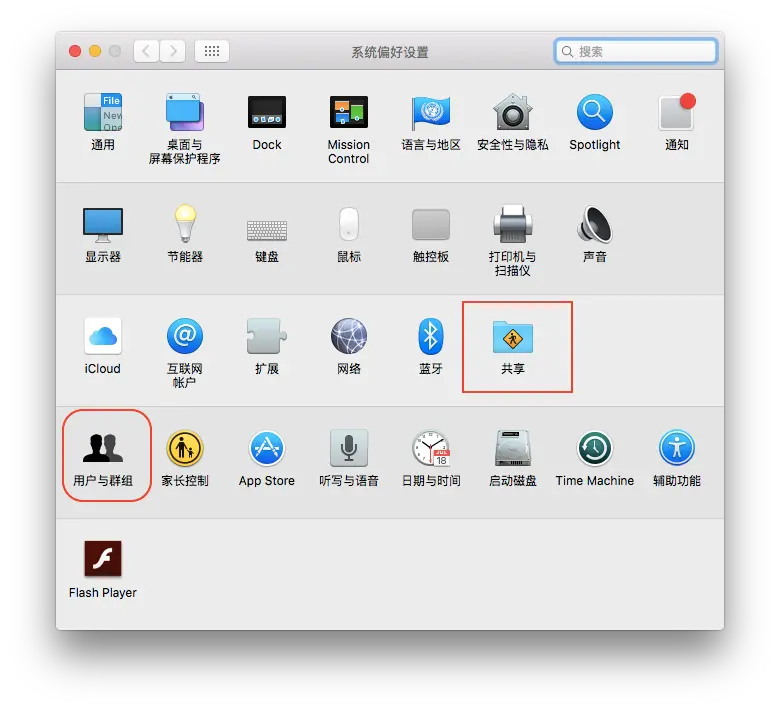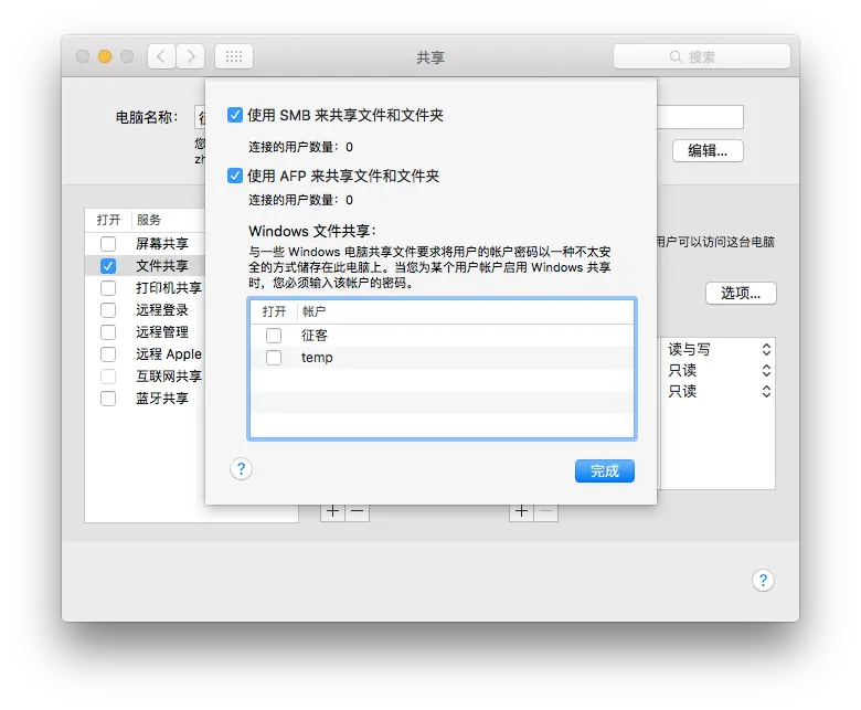 mac 设置文件夹共享 征客 2019-07-25 659 阅读1分钟 1、打开系统偏好设置  2、如果要给共享添加新用户,点击“用户与群组” 添加 3、点击共享  4、先择你要共享的文件夹,和你共享指定的用户。  5、点击先项,保证smb 已勾选。  这样就可以在局域网中用指定用户访问这个共享文件夹了。 若有凝问或错误,请指出,我好及时改正,让我们一起进步! email : vinson_bs@126.com qq : 103 586 2795 敲门砖: 代码谱写人生
