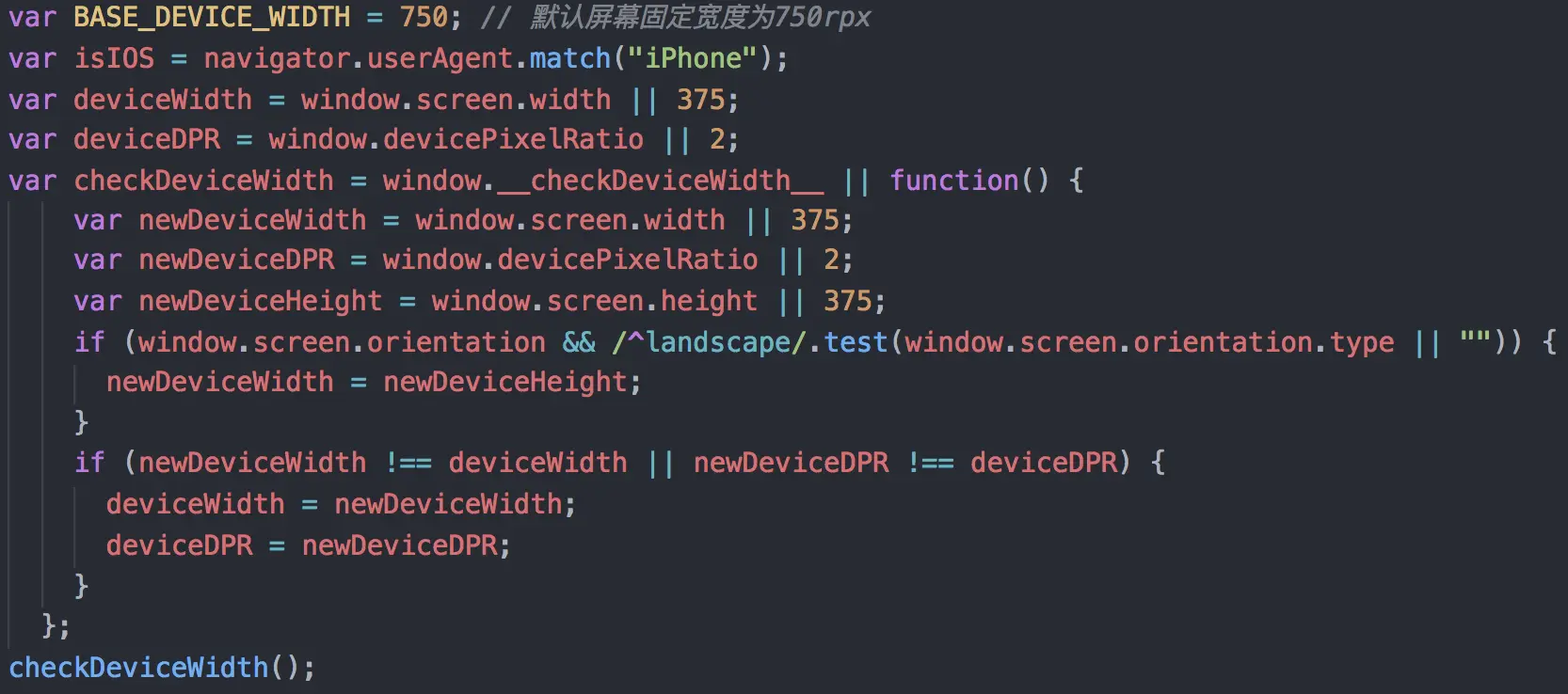 小程序开发者工具在初始渲染一个页面时会首先获取设备宽度deviceWidth和dpr,然后会通过checkDeviceWidth方法(wcsc可执行命令注入的代码)检查修正二者的值,因为屏幕orientation方向可能变化,在上面代码有这么一段: