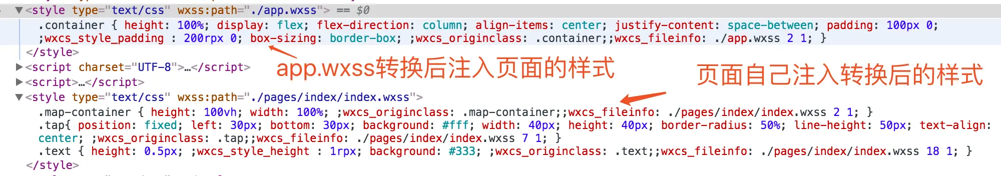上面提到的这些转换操作都是内置到小程序的wcsc可执行程序中,通过调用可执行程序来完成具体转换工作。最终注入到页面中的css内容如下图所示: