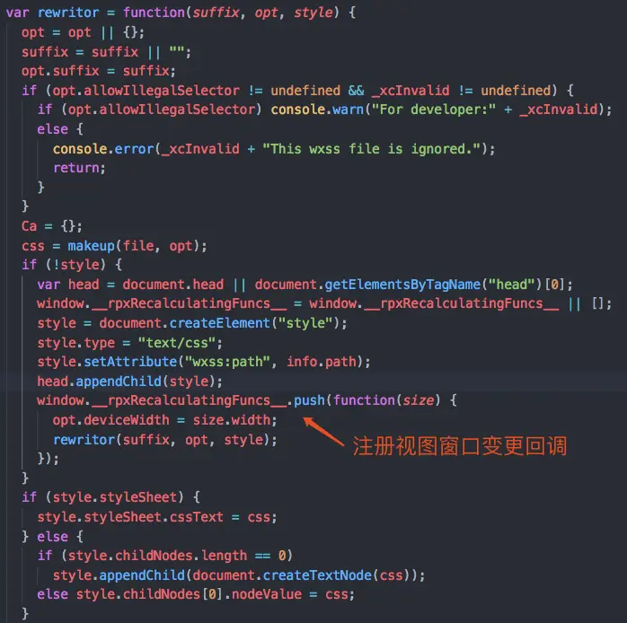 首先,在视图层,wxss样式文件经rpx初始转换后并将样式注入到页面过程中,会向window.__rpxRecalculatingFuncs__数组中收集窗口变化时的回调;先看wcsc可执行程序输出的处理rpx转换相关的setCssToHead函数实现,其最终返回rewritor函数,对应代码如下图: