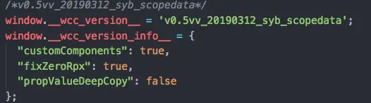 通过获取window.__wcc_version_info__.fixZeroRpx的值来判断rpx为0时如何转换;而window.__wcc_version_info__的定义赋值是在wcc可执行命令转换wxml文件生成的js脚本中完成的,下面是wcc生成有关赋值代码: