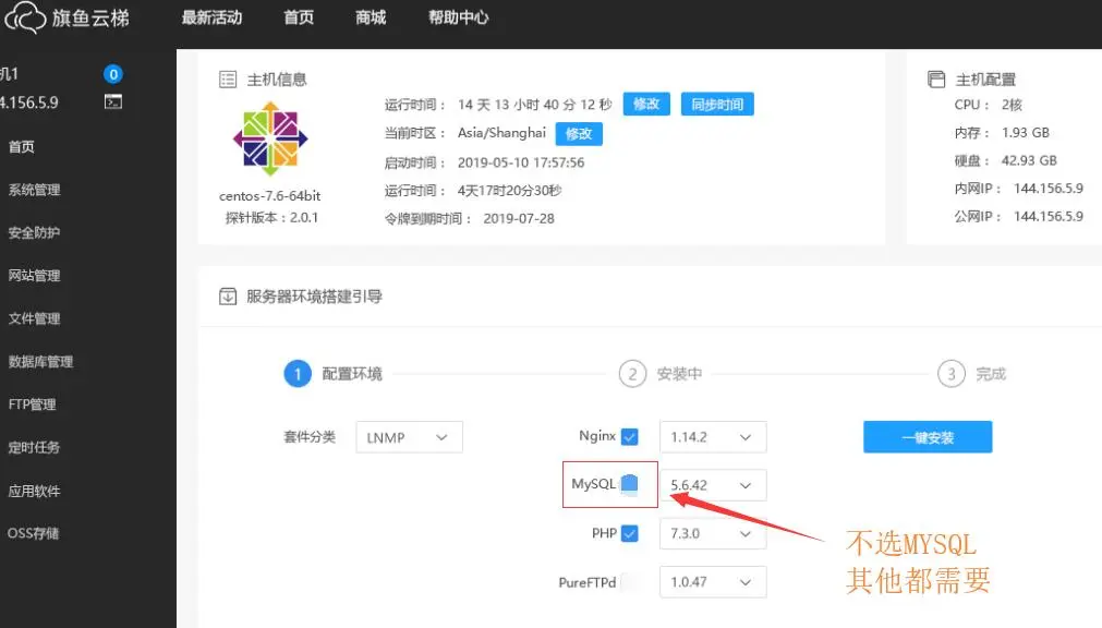 2、安装好旗鱼云梯后,一键部署web环境,记住不要安装数据库,只安装Nginx、php和ftp就可以了。