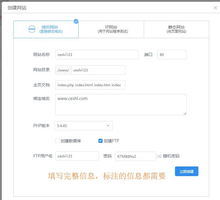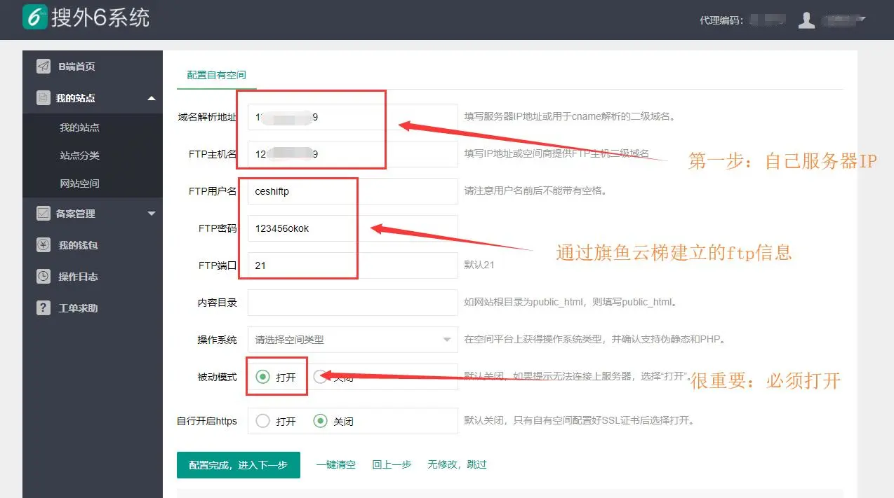 3、然后建设网站,设置域名,域名要提前绑定好这个服务器IP,ftp账号密码,建议复杂点。建设好后,旗鱼云梯这边告一段落,开始设置6系统。