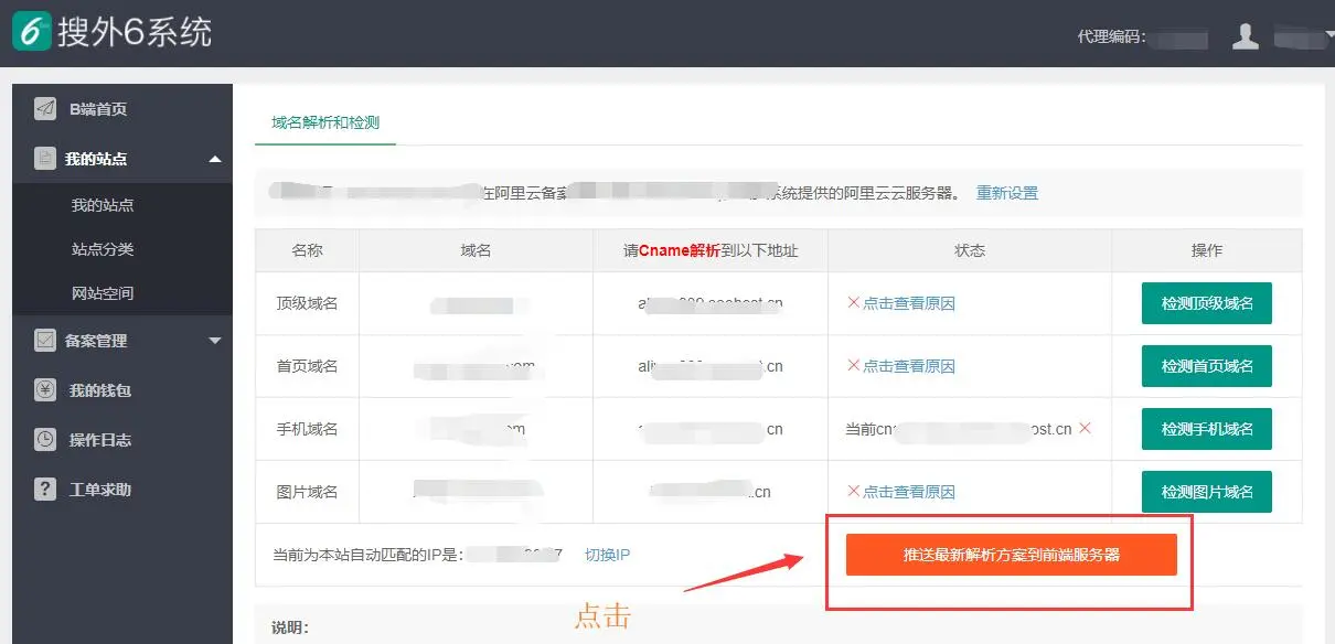 8、设置完后,回到我的站点选着空间这里,点击“推送最新解析方案到前端服务器”按钮,成功后就完成了设置。