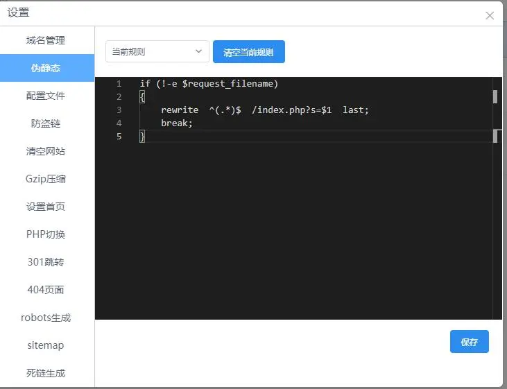 9、最后一步,回到旗鱼云梯里的网站管理,点击右侧“设置”在伪静态设置里面加上这段代码保存,到这里所有的技术设置就完成了。