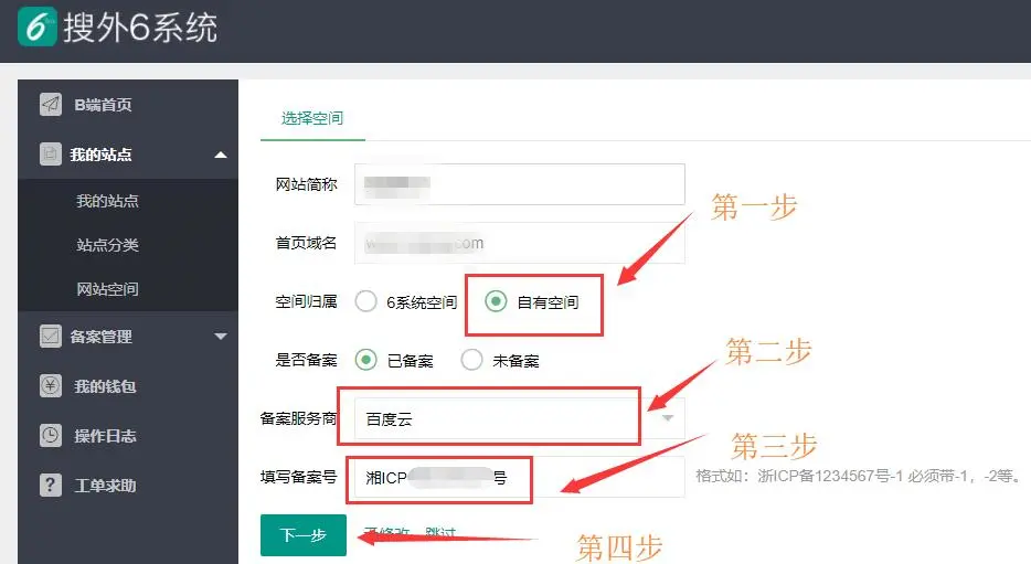 5、在选择空间这里选择“自有空间”如果是国内服务器必须填写你的备案号,确定后进入链接设置。
