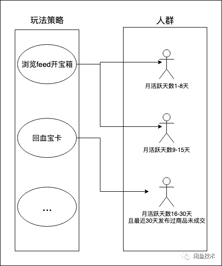 1. 人群圈选。每个玩法对应的受众是不一样的。打个比方,假如玩法目标在于提升留存率,对于高活人群来说活跃率已经足够高了,在这基础上投入现金红包激励,能够带来的活跃增量就很少,对应的ROI(投入产出比)就很低了,所以像浏览feed开宝箱的玩法,我们会投放给中低活人群。但针对引导发布商品的玩法策略“回血宝卡”,就适合投放给对应的发布高活人群。