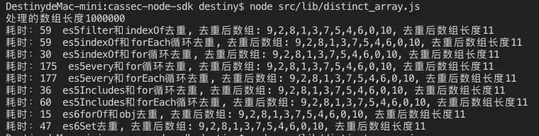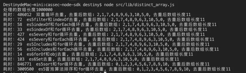 console.log(`耗时:${takeUpTime} ${distinctFunctionName}, 去重后数组: ${arr}, 去重后数组长度${arr.length}`);