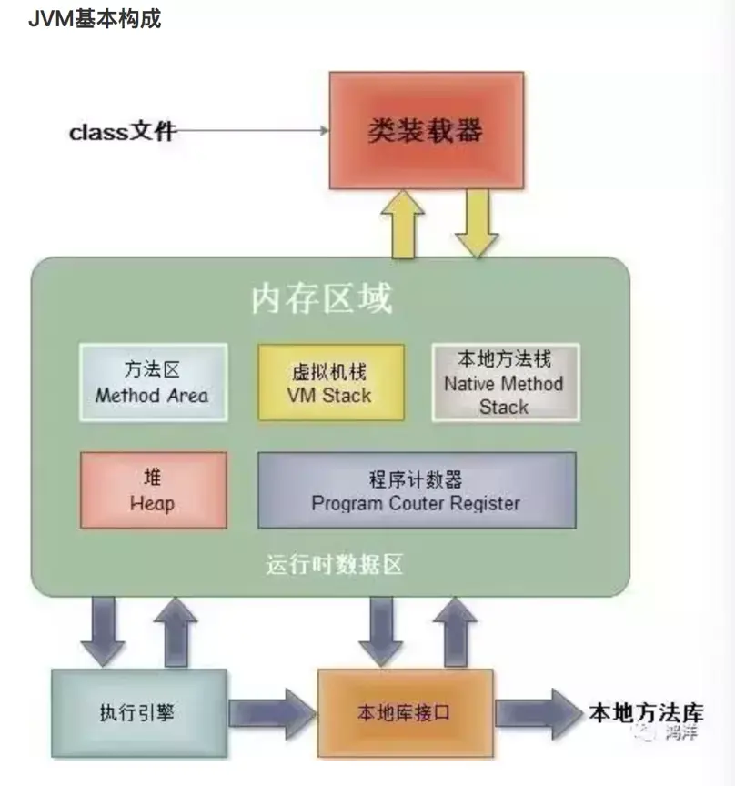 类加载器classLoader,在JVM启动时或者类运行时将需要的.class文件加载到内存中。 执行引擎,负责执行class文件中包含的字节码指令。 本地方法接口,主要是调用C/C++实现的本地方法及返回结果。 内存区域(运行时数据区),是在JVM运行的时候操作所分配的内存区, 主要分为以下五个部分,如下图: