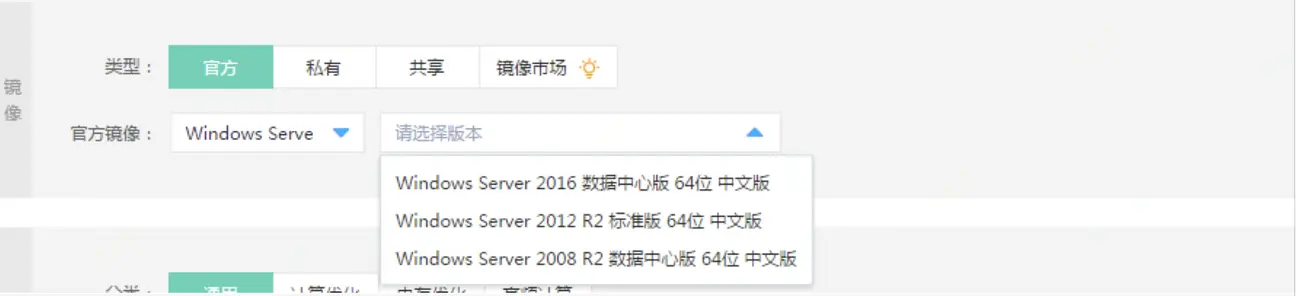 镜像分为云硬盘系统盘镜像及本地盘系统盘镜像,前者仅支持创建系统盘为云硬盘的实例,后者仅支持创建系统盘为本地盘的实例。因为搭建windows系统环境的NFS存储,故镜像选择官方-windows server-windows server 2012 R2标准版。