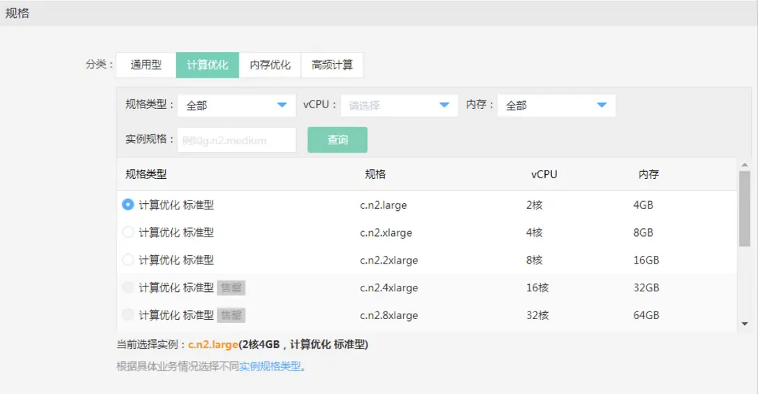 实例的规格支持用户自定义选择,从最小的1核1G(如g.s1.micro)到72C576GB(如m.n2.18xlarge),用户可以根据不同业务场景选择实例规格及相应配置。考虑到NFS对主机计算性能要求不高,选择2核4G规格主机。
