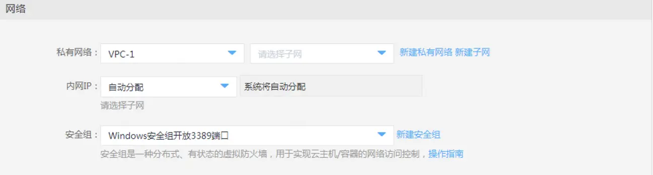 实例在创建时必须绑定一个安全组,若当前地域下未创建自定义安全组,可以在系统创建的三个默认安全组中选择一个绑定(每个私有网络创建成功之后都会自动创建三个默认安全组),也可以通过快速入口前往安全组页面创建安全组。由于官方镜像系统内防火墙默认关闭,建议绑定仅开放22端口(Linux)或3389端口(Windows)的安全组,实例创建之后再根据访问需求创建新的安全组并绑定。