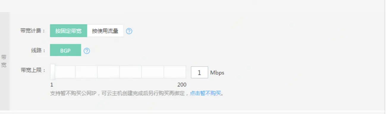 带宽范围:1Mbps~200Mbps。在创建主机过程中可以暂不购买公网IP,完成主机创建后,再进行绑定。