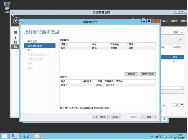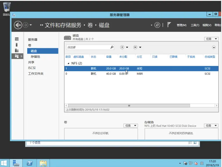 打开,开始菜单-服务器管理器-文件和存储服务-磁盘,如下图: