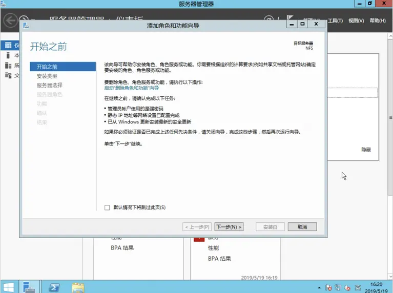 在“开始之前”对话框中,会显示配置成NFS服务器必要的前提步骤,请按文字介绍的注意事项确认一下,如果没有问题的话,可以单击“下一步”,如下图所示: