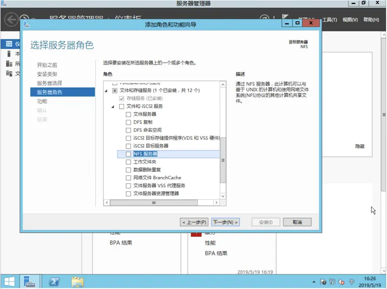 在“服务器角色”对话框中,选择“文件和存储服务”中“NFS服务器”,然后单击“下一步”,如下图所示: